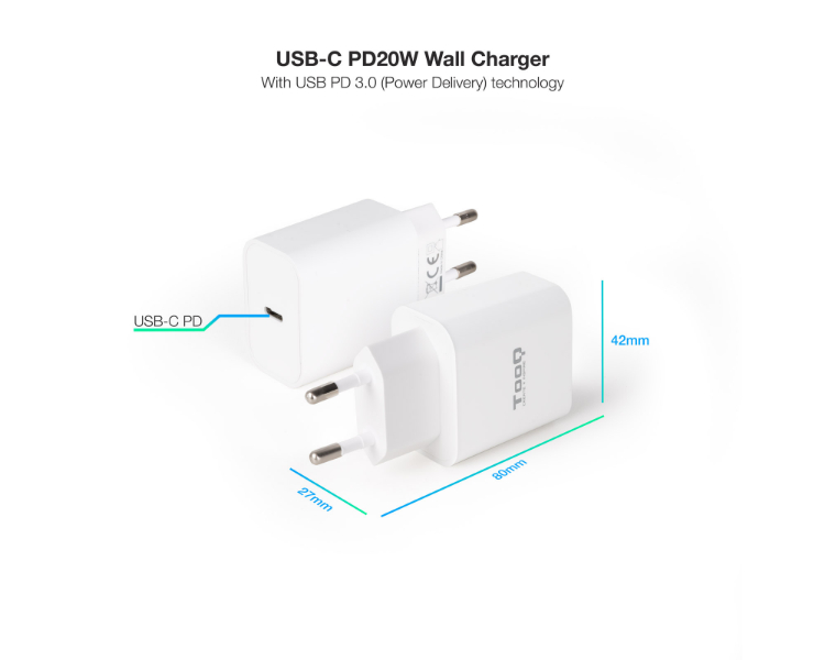 CARGADOR PARED USB-C/PD 20W BLANCO TOOQ