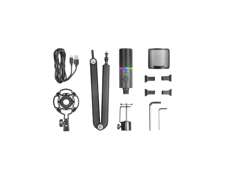 Soporte de amortiguación antivibratorio/ Filtro Pop de malla metálica/ Brazo de pluma omnidireccional/ Iluminación Dynamic ARGB Ring