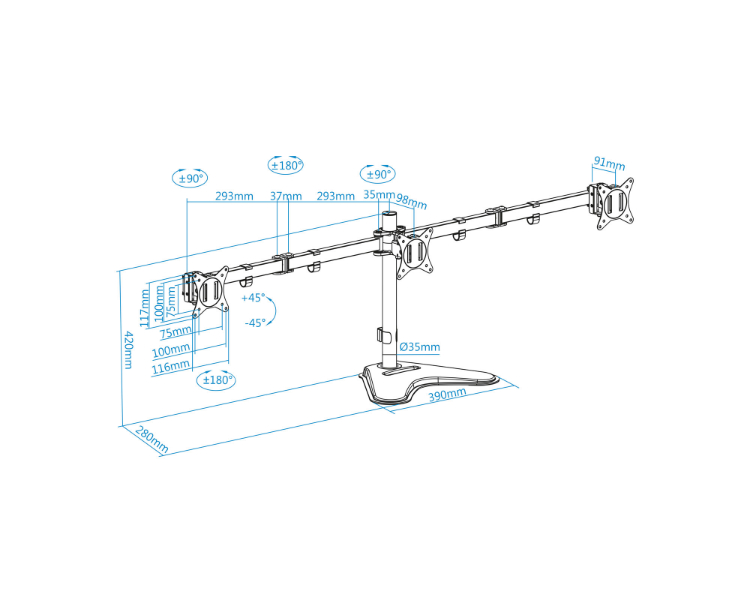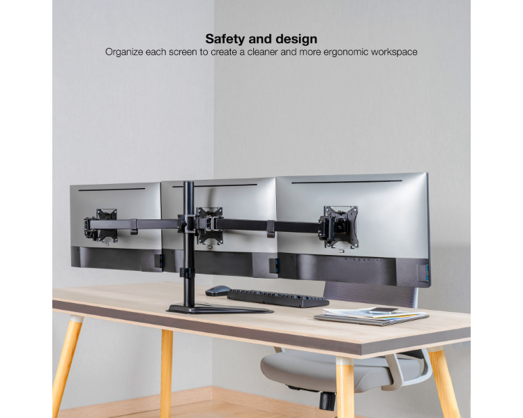 3 pantallas de 17 a 27"/ Rotación de 180º, giro de 90º, inclinación de 45º/ Máximo 7kg por brazo