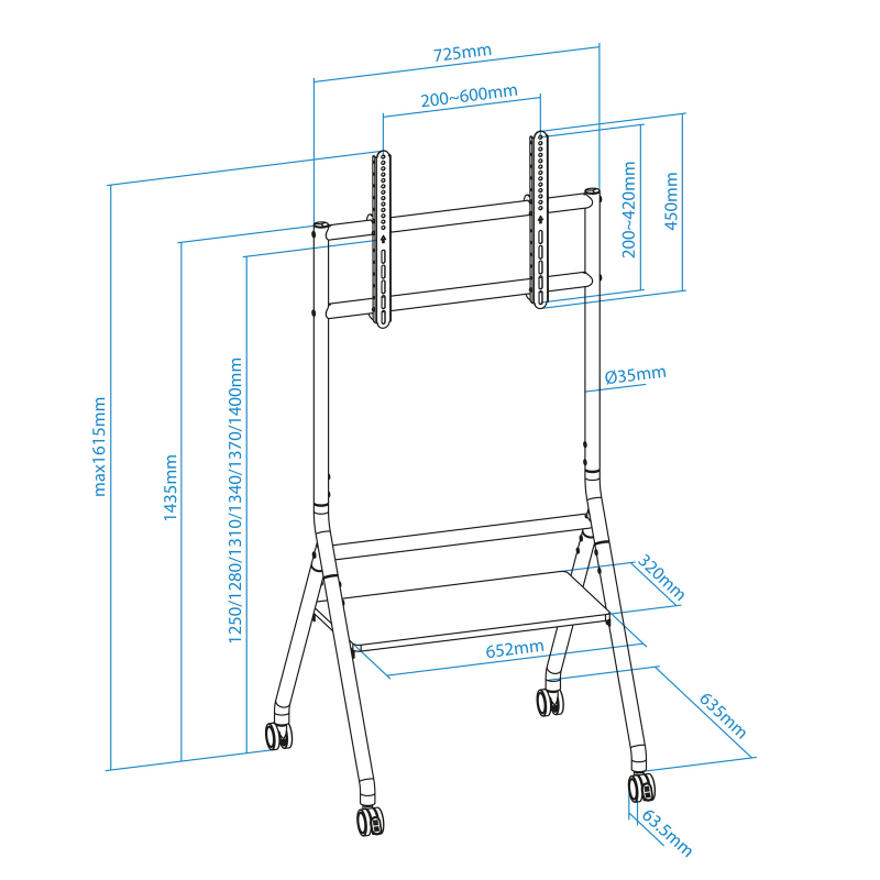 Pantallas de 37 a 86"/ VESA Max 600x400/ Hasta 80kg/ Bandeja inferior multiusos/ Ajustable en altura